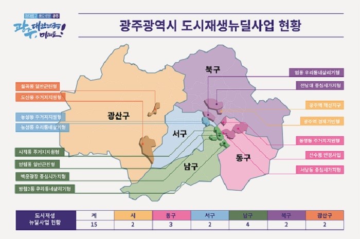 광주광역시에서는 지난 2017년 뉴딜사업 공모사업이 시작된 이후 2017년 3곳, 2018년 5곳, 2019년 4곳, 2020년 3곳이 선정돼 총 15개 사업장에서 2025년까지 총사업비 1조7000억 원이 투입돼 뉴딜사업이 진행되고 있다.