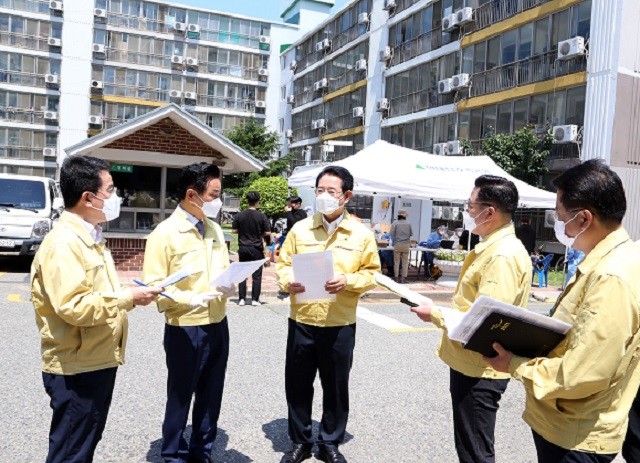 | ▲ 전동평 영암군수(좌측 2번째)가 지난 22일 삼호중공업 1차 아파트 선별진료소를 방문한 김영록 전라남도지사(가운데)에게 이슬람 종교행사와 관련 일부 미등록 외국인의 시설격리 비용에 대한 어려움을 호소하고 있다. / 사진=영암군 제공 |