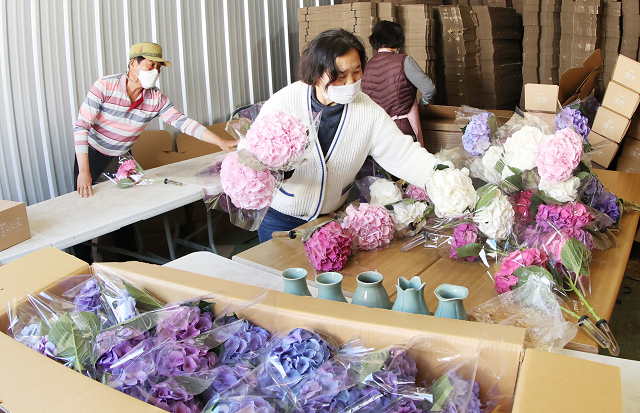 | ▲ 강진군 수국 화훼재배농가, 직거래를 위한 선별,포장,배송 작업 / 사진=강진군 제공 |