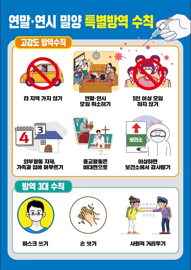 박일호 밀양시장은 “코로나19 확산 차단을 위해 보다 강력한 방역강화 조치 및 생활 속 실천이 어느 때보다 필요한 상황이다”며 “마스크 착용, 연말연시 모임ㆍ외출 자제, 타인 접촉 최소화, 새해 해맞이 자제 등 개인방역수칙 준수는 물론 시민들의 적극적인 참여를 부탁드린다”고 당부했다.