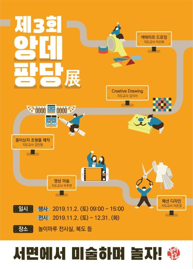이 앙데팡당展은 기존의 고정된 공간 및 정적인 작품 전시활동에서 벗어나 현장에서 체험하고 즐기면서 미술활동을 하고, 그 결과물을 놀이마루의 다양한 공간에 전시하는 학생 참여형 전시회다.