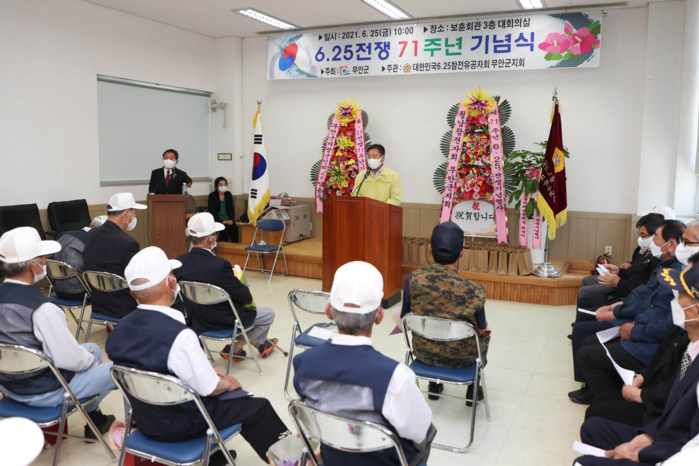 무안군(군수 김산)은 지난 25일 6.25참전 유공자회 무안군지회(지회장 김선열)에서 6.25전쟁 제71주년 기념식을 개최했다고 밝혔다.보훈회관에서 열린 이날 행사에는 김산 군수와 전남서부보훈지청 보상과장을 비롯한 관내 보훈단체장, 참전용사, 보훈가족 등 50여명이 참석했다.