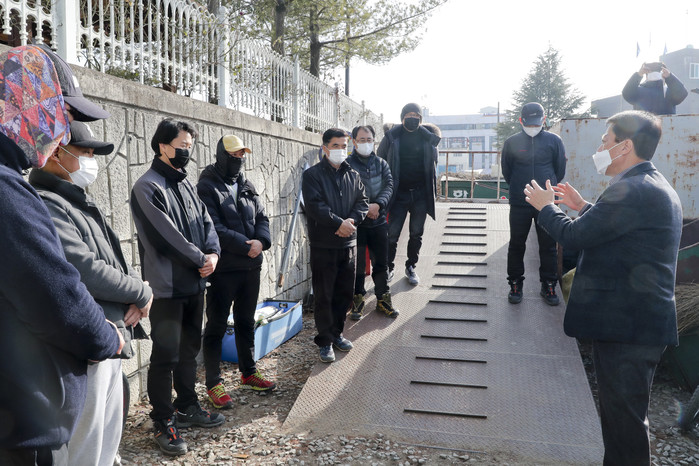 이날 현장을 찾은 문 군수는 도로결빙 예방작업, 상수도관 해빙작업, 쓰레기 수거작업에 대해 현장상황을 보고를 받은 후 현장 근무자들의 애로사항 및 건의사항 등이 담긴 현장의 목소리를 청취했다.