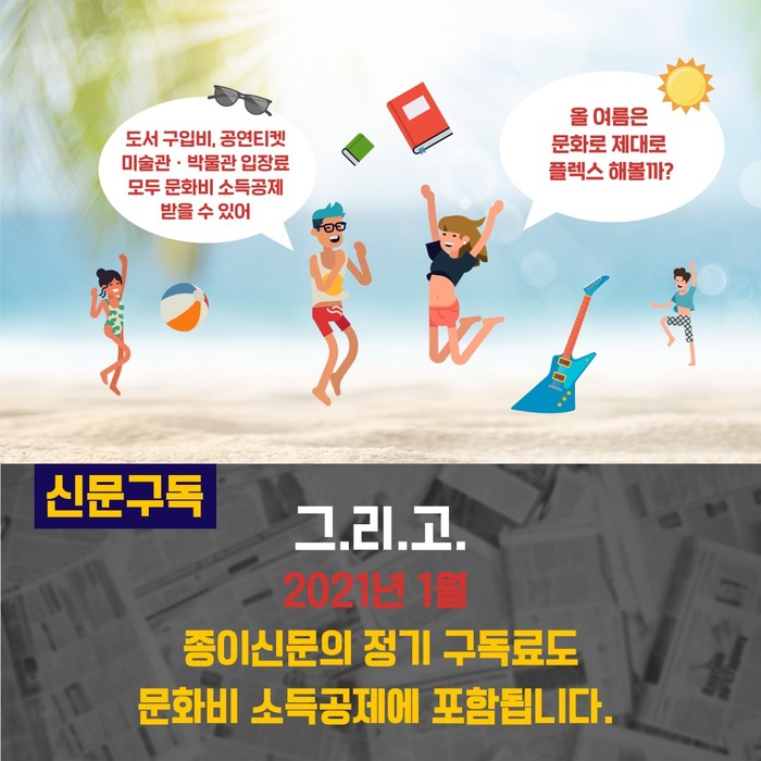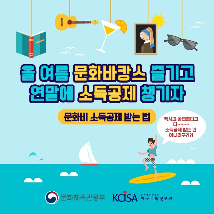 문화체육관광부 산하 한국문화정보원은 코로나19와 짧은 여름방학에 맞춰 시원하게 문화바캉스를 즐기고 소득공제를 받을 수 있는 방법을 소개한다.