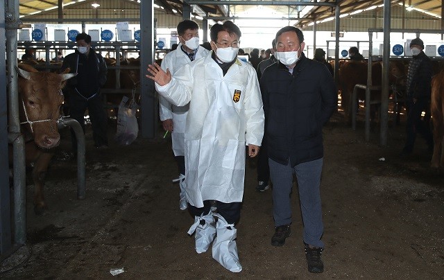 | ▲ 지난 4일 이승옥 강진군수(좌측)가 강진우시장을 찾아 축산농가와 우시장 종사자를 격려하고 있다. / 강진군 제공 |