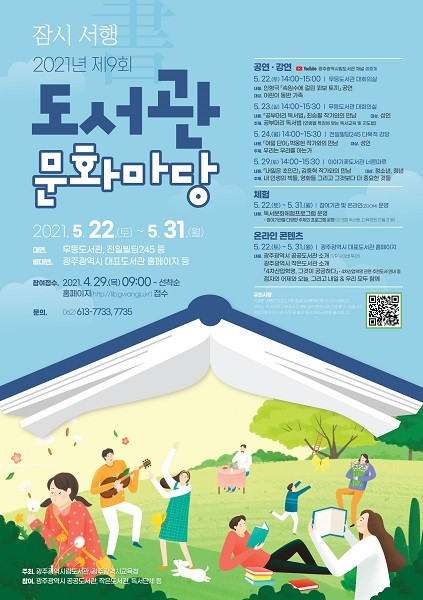 이번 행사는 광주지역 공공도서관, 작은도서관, 독서단체, 동네 책방 등 42개 기관이 참여해 ‘잠시 서(書)행’이라는 주제로 5월22일부터 31일까지 온라인과 참여기관에서 운영한다.