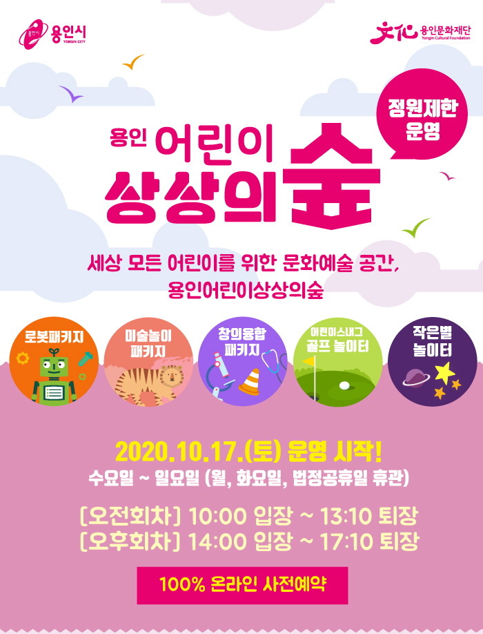 [용인=오왕석 기자] (재)용인문화재단(이사장 백군기) 용인어린이상상의숲(이하 상상의숲)은 코로나19로 인한 휴관을 종료하고 오는 17일(토)부터 재개관한다. 지난 11일(일) 중대본의 사회적 거리두기 1단계 하향 발표에 따라 온라인 사전 예약을 통한 정원 제한(1인당 거리두기 공간 확보 및 평균 관람객수 50% 미만 종합 고려) 방역안전관리 시스템으로 운영된다.
