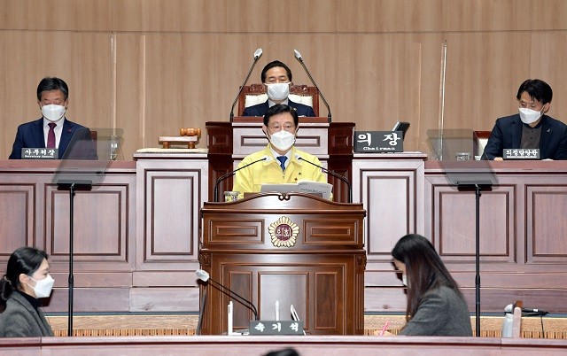| ▲ 이용섭 광주광역시장이 1일 오전 광주시의회 본회의장에서 열린 제295회 임시회 제1차 본회의에 참석해 2021년도 주요 업무계획을 보고하고 있다./광주광역시 제공 |