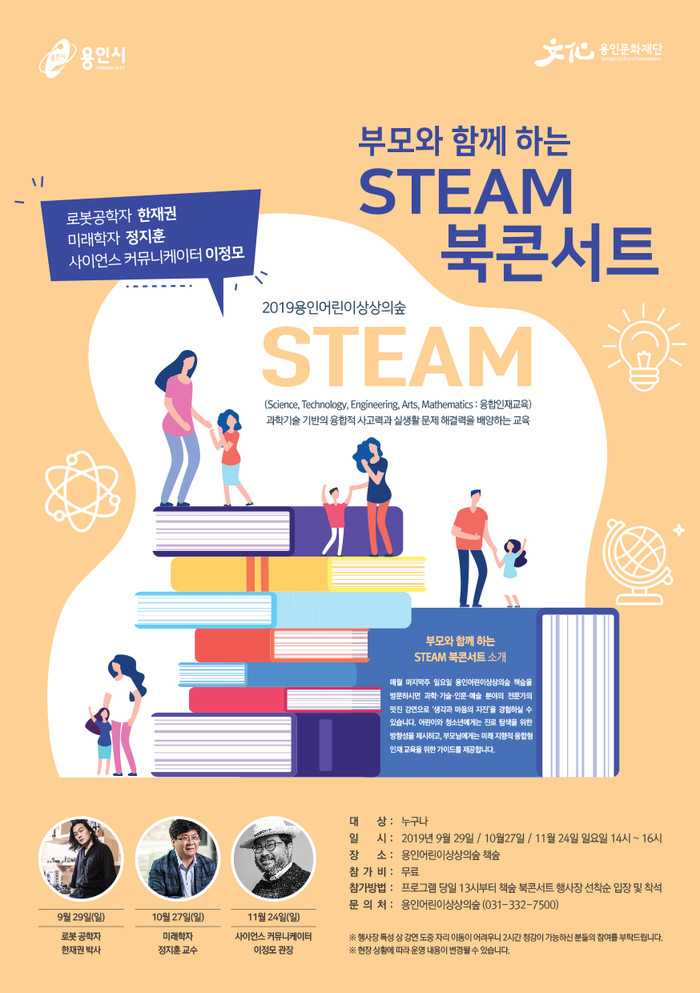 부모와 함께하는 STEAM 북 콘서트(9월 29일,10월 27일,11월 24일)상상의숲에서는 책을 기반으로 한 과학기술 융합 사고력과 실생활 문제 해결력을 배양하고자 <2019 부모와 함께하는 STEAM 북 콘서트>를 9월 29일, 10월 27일, 11월 24일(매 월 마지막 주 일요일 오후 2시) 진행한다.