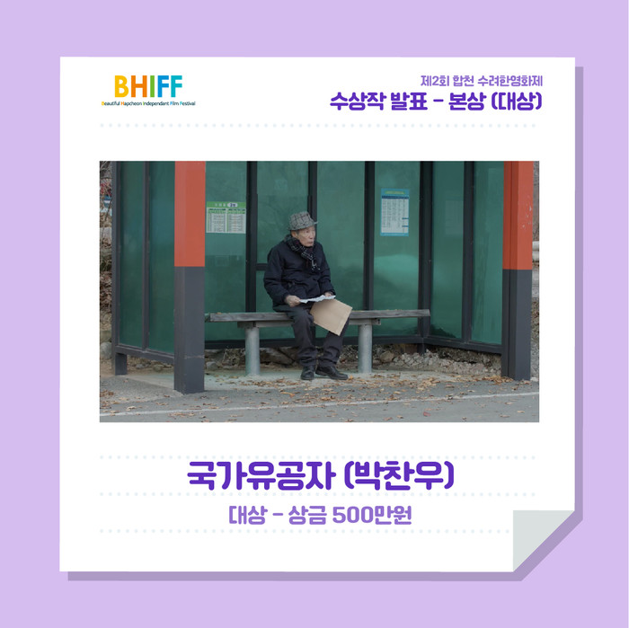 제2회 합천 수려한영화제의 영예의 대상은 박찬우 감독의 <국가유공자>가 심사위원 만장일치로 선정됐다. 아버지와 아들의 갈등이라는 평범한 소재를 다루고 있는 이 영화는 아버지를 악마화하거나 아예 아버지가 부재하는 최근 한국 영화의 어떤 서사적 경향 속에서 아버지의 내면을 통해 아들 세대와는 다른 삶을 살았던 아버지의 삶을 다시 생각게 하는 영화로, 특히 박찬우 감독의 안정적인 연출력과 배우들의 연기가 돋보였다.