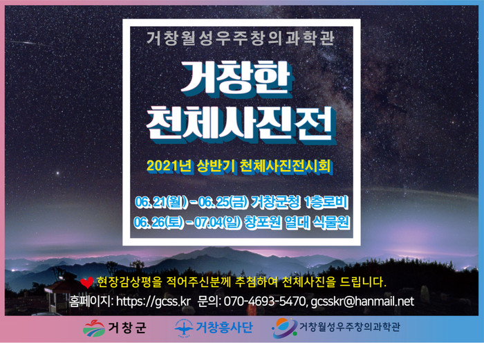 거창군은 오는 21일부터 7월 4일까지 14일간 군청 로비와 창포원 열대식물원에서 ‘2021년 상반기 거창한 천체사진전’을 개최한다.