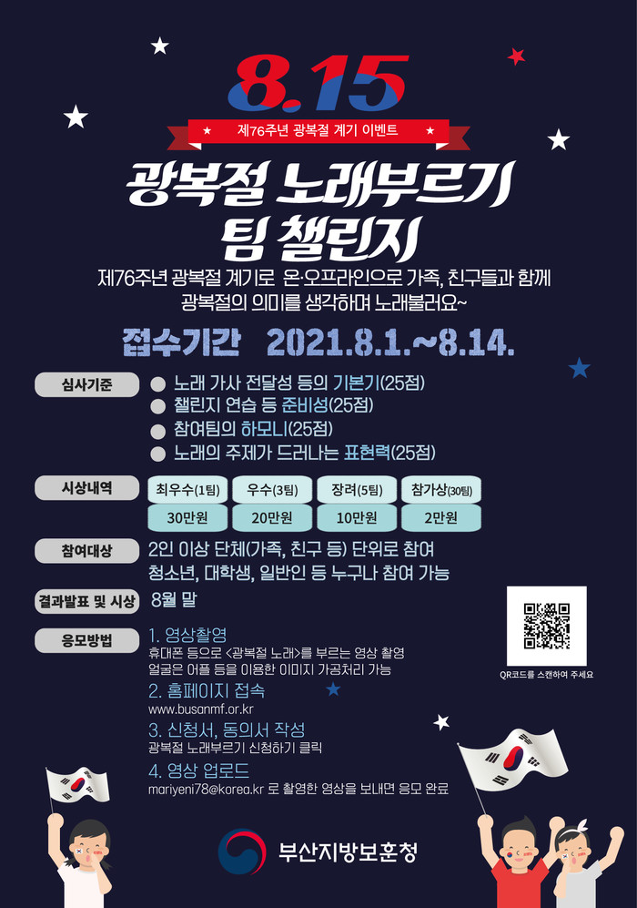 지난 ‘삼일절 노래’, ‘현충일 노래’ 부르기 챌린지에 이어 제76주년 광복절을 계기로 ‘광복절 노래 부르기 팀 챌린지’ 이벤트를 오는 8월 1일(일)부터 8월 14일(토)까지 진행하며, 청소년, 대학생, 일반인 등 2인 이상의 단체는 누구나 참여 가능하다.