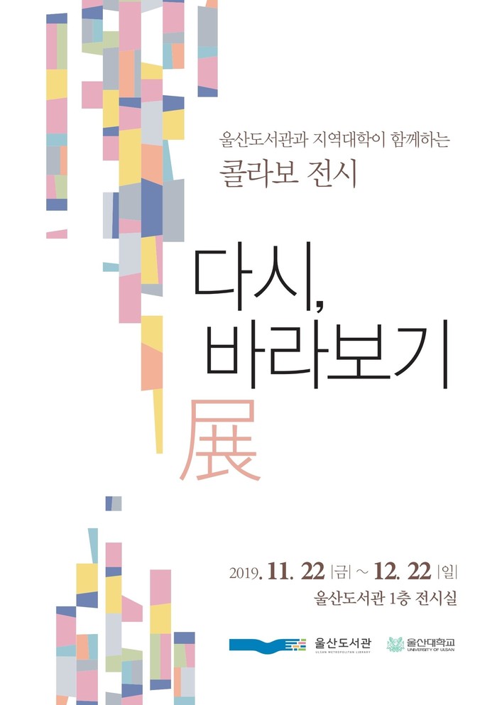 울산시 도서관은 11월 22일부터 12월 22일까지 울산도서관 1층 전시실에서 울산도서관과 지역대학이 함께하는 콜라보 전시 ‘다시, 바라보기전(展)’을 개최한다.