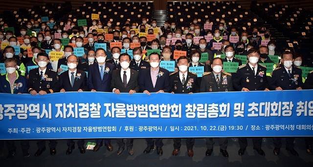 [광주=정찬남 기자] 이용섭 광주광역시장(앞줄 좌측부터 6번)이 지난 22일 오후 시청 대회의실에서 열린 광주광역시 자치경찰 자율방범연합회 출범식에 참석해 유공방범대원에게 표창을 한 후 참석자들과 함께 기념촬영을 하고 있다.