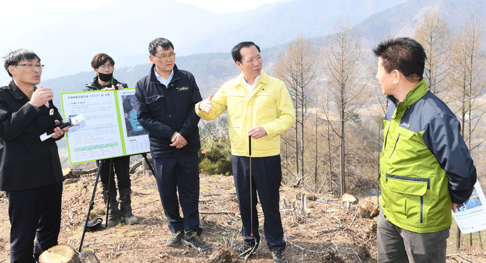 구인모 거창군수는 코로나19 예방과 확산방지를 위해 모든 행정력을 기울이는 바쁜 일정에도 불구하고, 지난 1일 거창군 북상면 소정리 일원 군유 임야에 조성 중인 명품 자작나무 숲 조성 현장을 방문해 추진사항을 점검하고 코로나19로 인해 취소된 식목일 나무심기 행사를 대신해 자작나무를 직접 식재해 보였다.