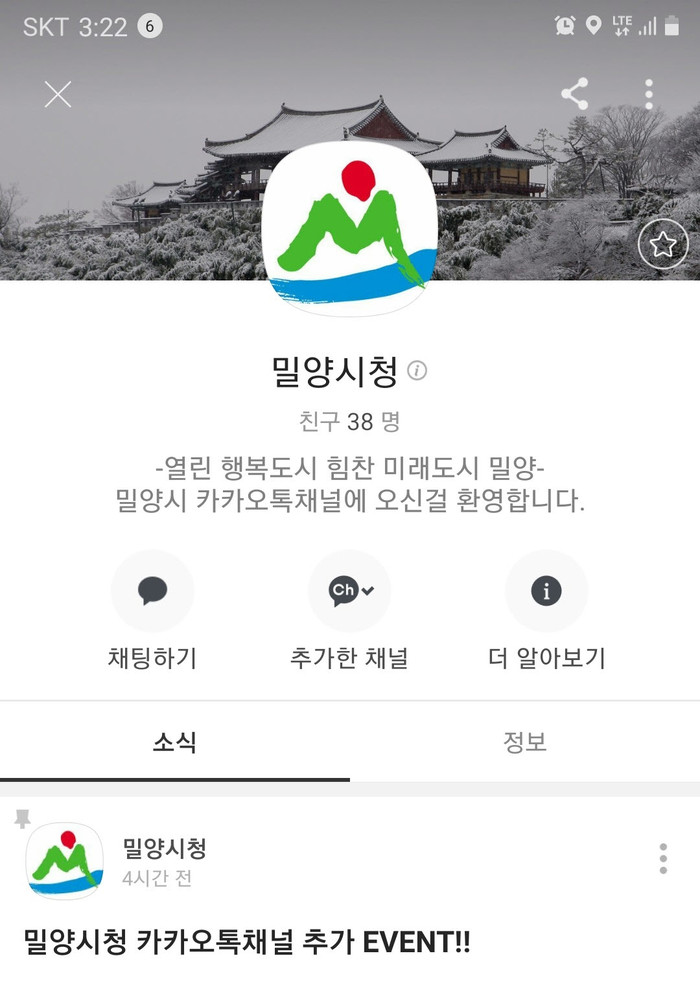| ▲ 밀양시 카카오톡채널 메인화면 |