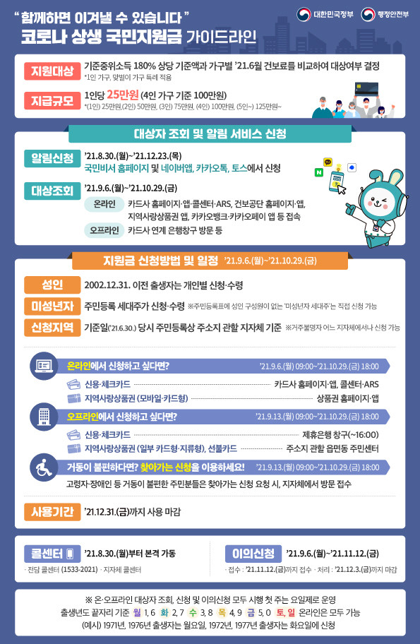 지급대상 조회 및 신청은 오는 6일부터 온라인, 13일부터는 카드사 연계 은행창구나 읍·면사무소에서 가능하며 10월 29일에 마감한다.
