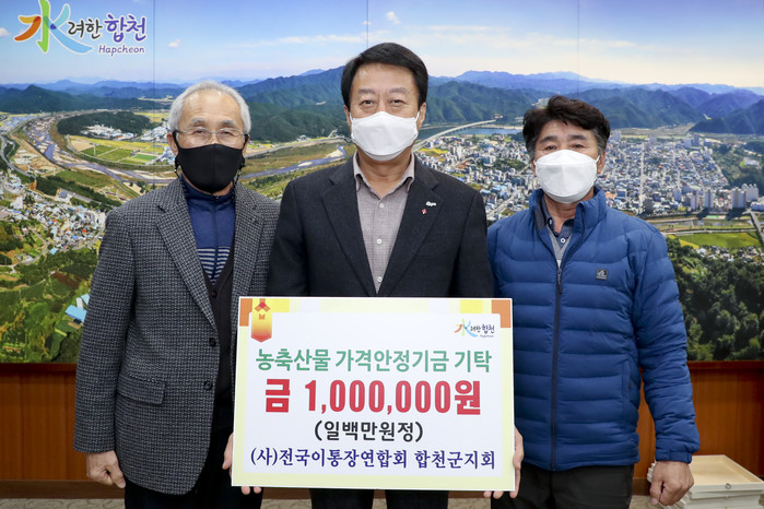 (사)전국이통장연합회 합천군지회 김도섭 회장과 회원 일동은 합천군청(군수 문준희)을 방문해 민선 7기 공약사업인 농축산물 가격안정기금 300억 조성에 보태달라며 100만원을 문준희 군수에게 전달했다.