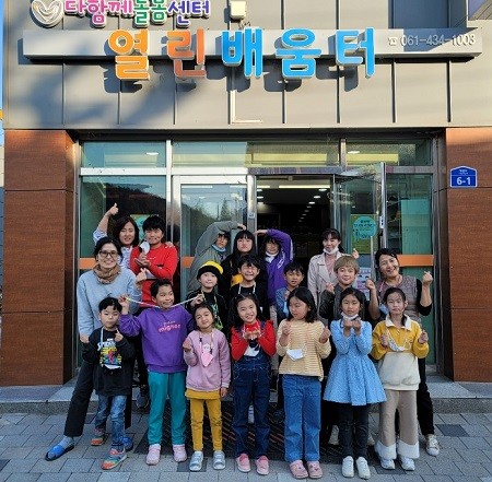 | ▲ 강진군 다함께 돌봄센터 열린배움터 어린이들과 관계자 일동 기념촬영 / 강진군 제공 |