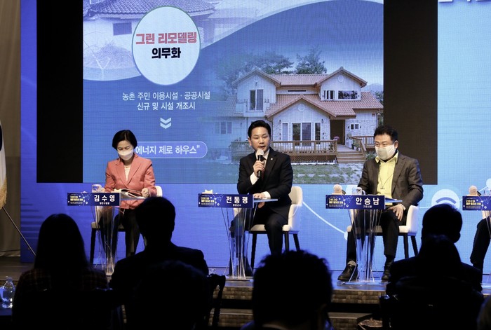 김수영 양천구청장을 좌장으로 전동평 영암군수, 안승남 구리시장, 노규성 한국생산성본부회장, 이헌중 한국정보화진흥원 본부장이 참여해 진행된 패널토론에서 전동평 군수는 그린뉴딜 주요 정책으로 ▲그린뉴딜 거버넌스 체계 구축 ▲농촌지역 건축물 그린리모델링 추진 ▲주민참여형 신재생 태양광발전 확대▲풍력발전 활성화 및 주민참여 확대 ▲신재생 에너지 스마트팜 조성사업 확대 ▲경관농업의 확대 ▲산림자원의 보전과 활용을 위한 그린뉴딜사업 추진 ▲귀농·귀촌인의 안정적 정착과 영농기반 구축 ▲그린뉴딜 성공을 위한 지방정부의 역할 등을 제시했다.