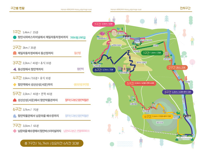 ‘아라가야 역사 순례길(이하 순례길)’은 총 7구간(17.6km), 51개의 이정표로 연결된 코스로 정자와 연못, 시장과 공원 등 역사도시 함안의 다채롭고 활기찬 풍경을 두루 감상할 수 있는 걷기 길이다.