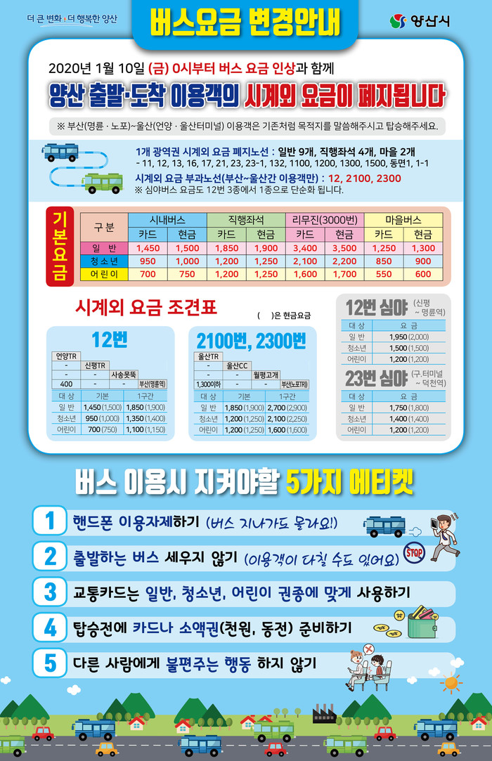 이번 요금 인상은 2015년 8월 이후 약 4년 5개월 만에 요금이 오르는 것이며, 경상남도 18개 시군이 동시에 시행된다. 특히 양산시는 요금인상과 함께 시민들이 불편을 겪었던 1개 광역권 시계외 요금 폐지가 동시에 시행된다.