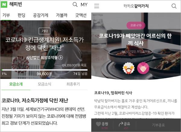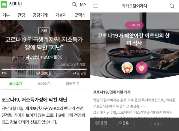 감염 취약층인 65세 이상 어르신들의 집단 감염 예방을 위하여 각 지역 무료급식소와 복지시설 등이 폐쇄된 상황에서, 빈곤노인과 저소득층 지원을 위한 ‘코로나19가 빼앗아간 어르신의 한 끼 식사(카카오 같이가치)’, ‘코로나19 긴급생계지원! 저소득가정에 닥친 재난(네이버 해피빈)‘ 모금함이 그 예다.