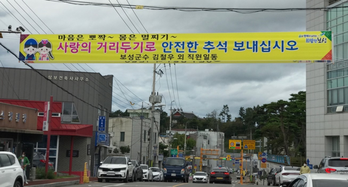 보성군 시가지에 추석 명절 동안 고향 방문과 이동 자제를 당부하는 현수막이 걸려있다.