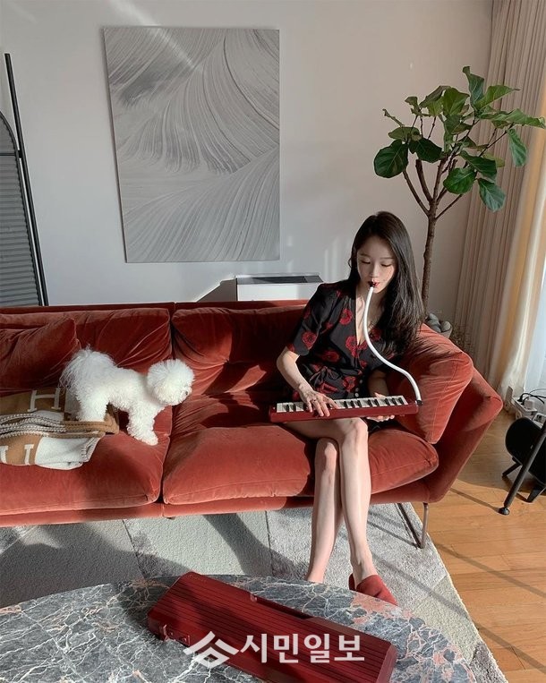 공개된 사진 속 그는 멜로디언을 불며 소파에 앉아 있는 강민경의 모습이 담겨 눈길을 모았다.