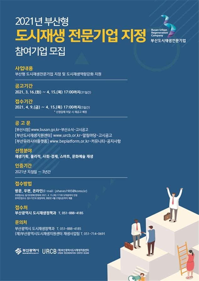 부산시(시장 권한대행 이병진)는 도시재생사업의 활성화 및 부산 지역기업의 경쟁력 향상을 도모하기 위해 「도시재생전문기업 지정 공모」를 추진한다고 밝혔다.