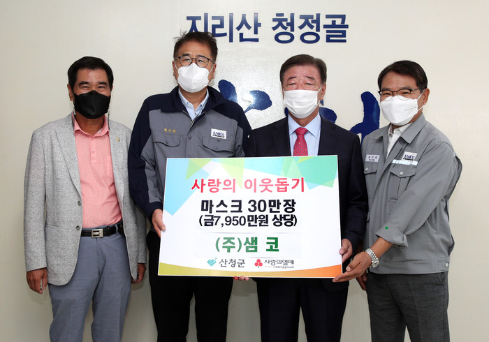 항공기 도어 등 부품 제조기업 ㈜샘코(대표이사 정기환)가 2일 산청군을 찾아 7950만원 상당의 마스크 30만장을 기탁했다.