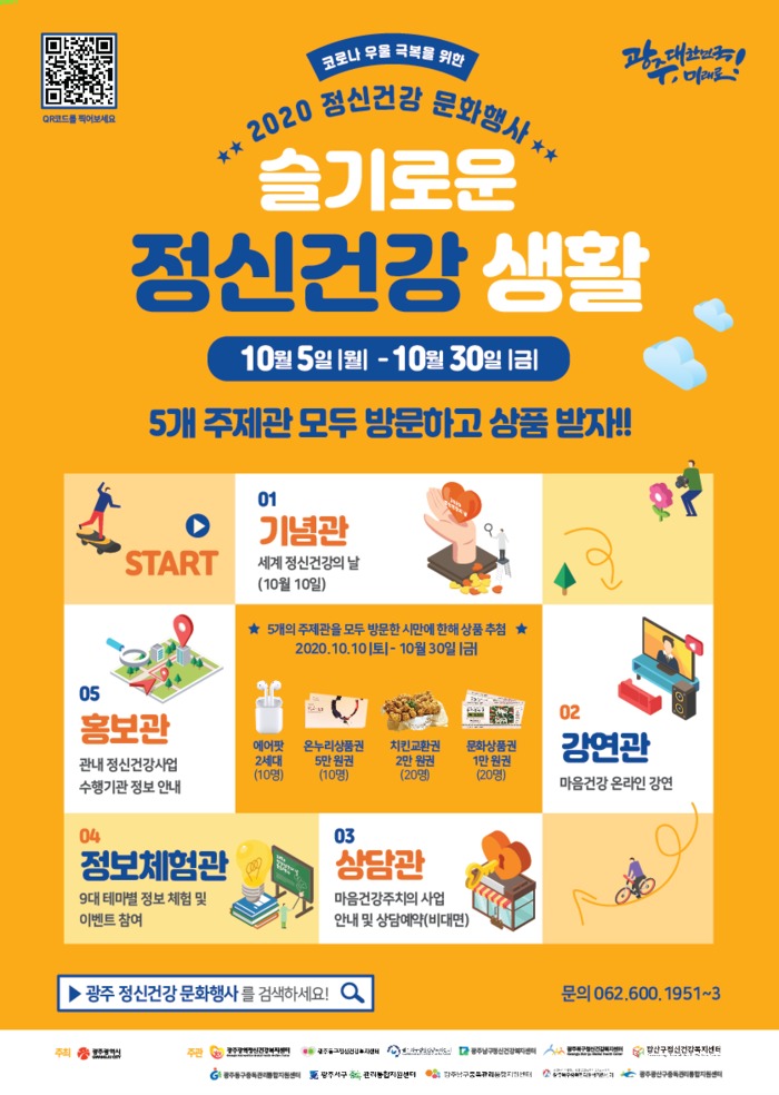 광주시가 주최하고 광주광역정신건강복지센터, 5개구 정신건강복지센터, 5개구 중독관리통합지원센터가 공동으로 주관하는 이번 행사는 코로나 우울 극복을 위한 ‘슬기로운 정신건강생활’을 주제로 5일부터 30일까지 온라인을 통해 시민들과 함께한다.