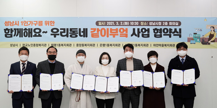 [성남=오왕석 기자] 성남시(시장 은수미)는 3월 2일, 1인 가셀구 공유부엌 사업인 “함께해요! 우리동네 같이부엌” 사업 추진을 위해 6개 기관과 업무협약(MOU)을 체결했다.