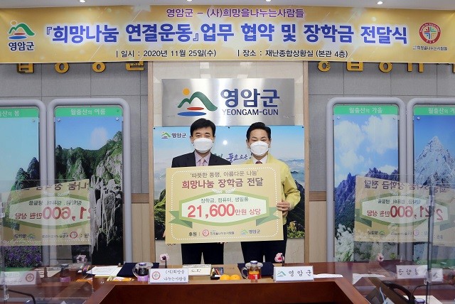 이번 업무협약을 통해 (사)희망을 나누는 사람들에서는 영암군 관내에 사회적으로 소외되고 어려운 환경에 있는 저소득 초중학교 장학생 12명에게 1,600만 원 상당의 장학금과 컴퓨터를 전달하고 앞으로 2년간 영암군 관내 저소득 아동·청소년에 대한 장학금 지원 및 소외가정에게 2억 원 상당의 생필품을 추가로 지원키로 했다.