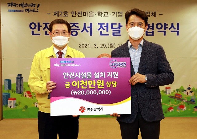 광주지역 교통안전시설물 전문업체인 ㈜세연이엔에스는 앞으로 매년 선정된 안전마을, 안전학교에 대해 2000만원 상당의 안전시설물 설치, 컨설팅, A/S 등을 지원한다.
