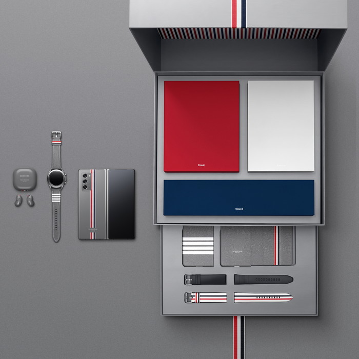 '갤럭시 Z 폴드2' 플립 커버는 제품의 디자인과 동일하게 톰브라운 멀티컬러 스트라이프 패턴을 적용해 고급스러운 지갑과 같은 느낌을 주며, 백 커버는 시그니처 패턴을 적용해 캐주얼한 느낌을 제공한다. '갤럭시 워치3' 스트랩은 톰브라운 멀티컬러 스트라이프 패턴의 가죽 스트랩과 블랙 불소고무 스트랩이 추가로 제공되어 보다 다양한 스타일링이 가능하도록 했다.