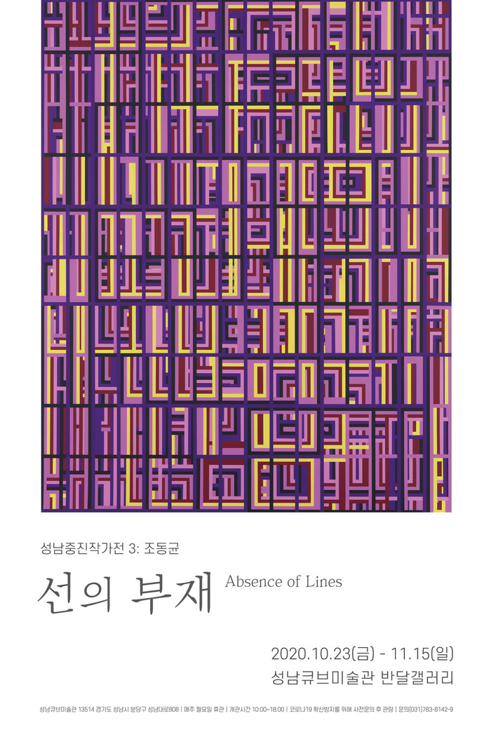 [성남=오왕석 기자] 성남문화재단(대표이사 노재천)이 2020성남중진작가전 시리즈의 세 번째 전시로 ‘조동균 : 선의 부재(Absence of Lines)’를 오는 10월 23일부터 11월 15일까지 성남큐브미술관 반달갤러리에서 개최한다.