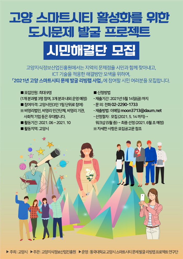 [고양=이기홍 기자] 고양시와 고양지식정보산업진흥원( 이하 진흥원)은 “ 2021년 고양 스마트시티 문제 발굴 리빙랩 사업 ”에 참여할 시민해결단을 공개 모집한다.