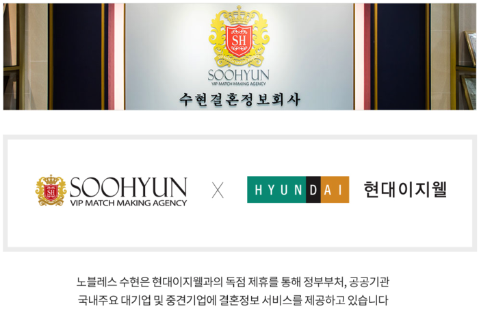 현대이지웰은 1,700여개 고객사의 약 200만명 임직원 고객을 보유 중인 국내 기업복지서비스 1위 기업으로, 노블레스 수현과 제휴를 맺고 대기업 및 공기업 임직원을 대상으로 결혼정보서비스를 제공 중이다.