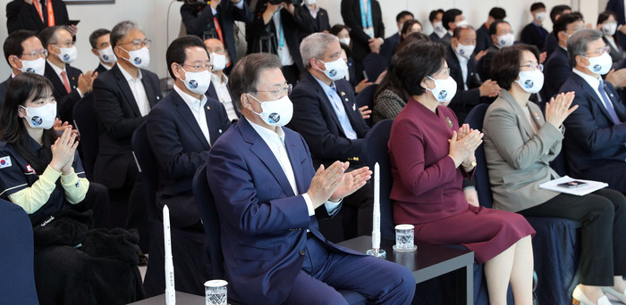 | ▲ 우주 누리호 발사 현장인 고흥 나로 우주센터에 김영록 전남도지사는 문재인 대총령이 참석한 자리에서 발사 성공을 축하하고 있다.(출처=전남도청) |