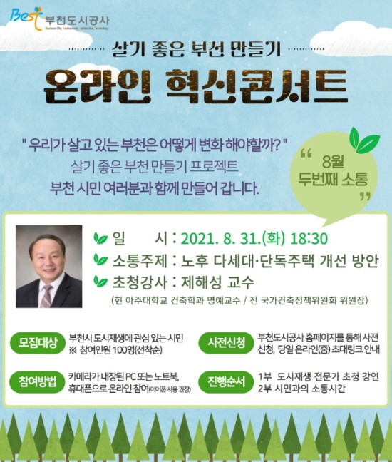 부천도시공사에 따르면 콘서트에서는 제해성 아주대 건축학과 명예교수(前 국가건축정책위원회 위원장)를 초청, ‘노후 다세대·단독주택 개선 방안’을 강연한다.