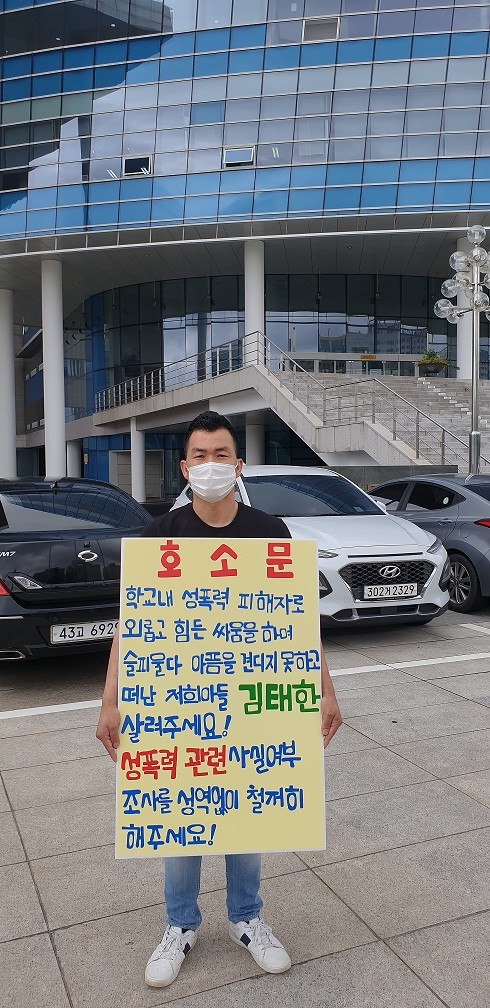 A군의 부모는 도교육청 앞에서 1인시위를 하며 가해자 엄중 처벌을 요구하고 있다.