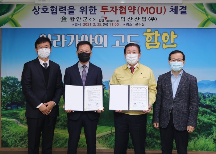 함안군은 지난 2월 25일 오전 11시 군수실에서 덕산산업㈜와 90억 원 규모의 투자협약(MOU)을 체결했다.