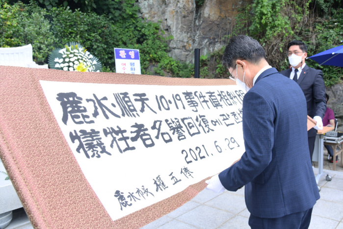 이날 참배는 헌화, 분양과 함께 ‘여수‧순천 10‧19사건 진상규명 및 희생자 명예회복에 관한 특별법’의 법안명을 족자로 제작해 권 시장이 직접 위령비 제단에 헌물하며 희생자의 넋을 달랬다.