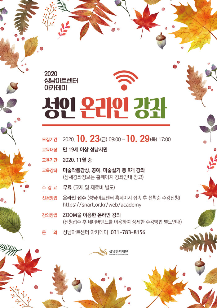 모든 강좌는 온라인 플랫폼 줌(ZOOM)을 통해 실시간 원격 수업으로 진행하며, 성남아트센터 홈페이지 아카데미 수강신청 페이지에서 23일(금)부터 29일(목)까지 선착순으로 접수한다.