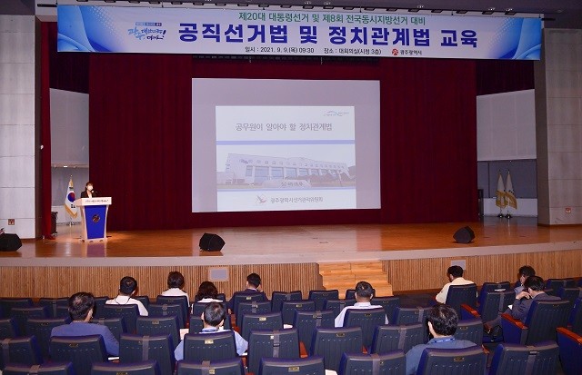 [광주=정찬남 기자] 광주광역시는 9일 오전 시청 대회의실에서 내년 실시되는 제20대 대통령선거(2022.3.9.)와 제8회 전국동시지방선거(2022.6.1.)에 대비해 시청 공직자를 대상으로 현장 및 온라인으로 ‘공직선거법 교육’을 실시했다.