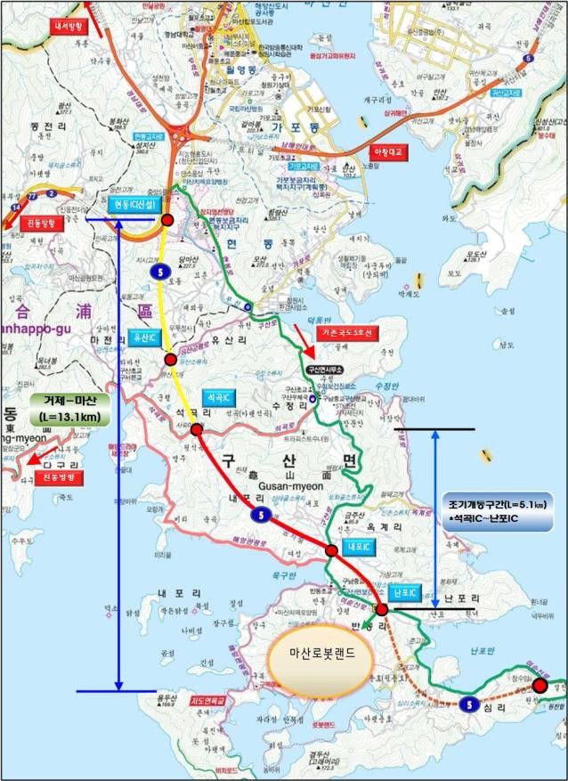 거제-마산 국도건설공사는 창원시 마산합포구 구산면 심리~현동까지 13.1㎞를 4차로로 신설하는 공사로 2020년 6월 준공예정이나 마산 로봇랜드 교통 혼잡해소를 위해 10개월 이상 앞당겨 우선 개통한다.