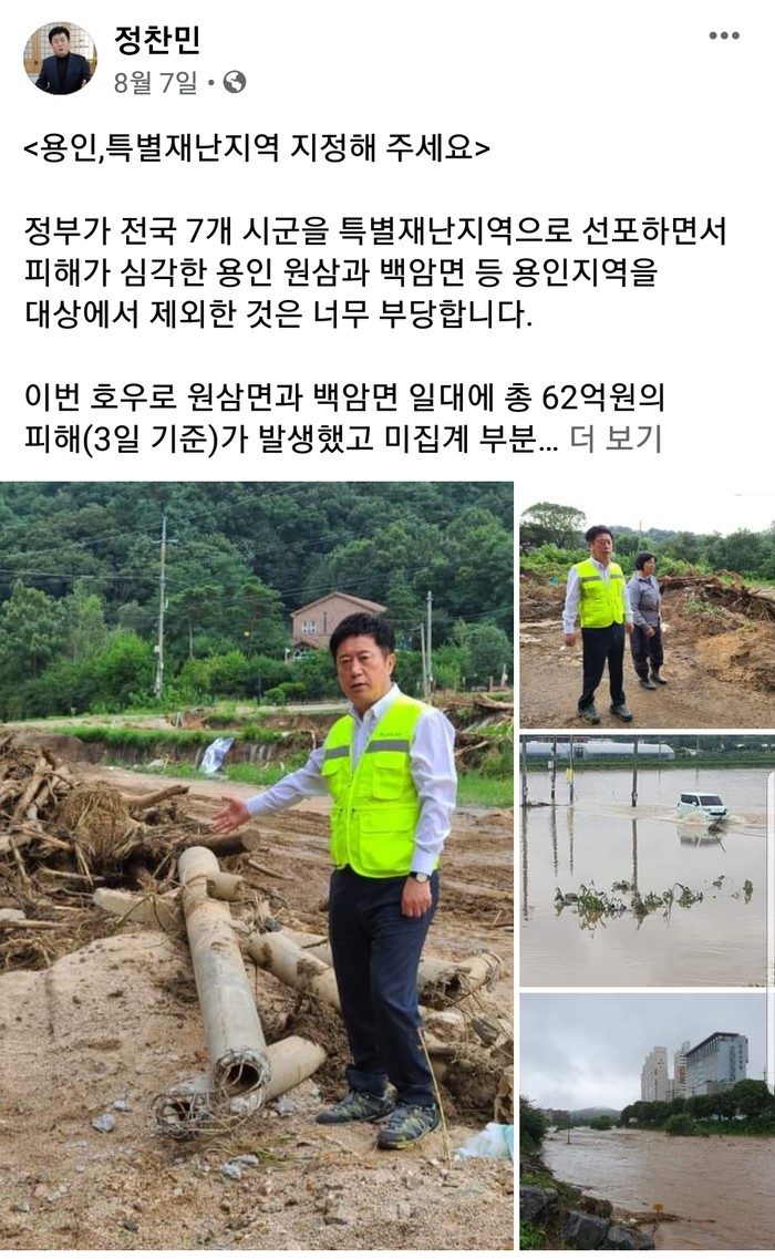 실제로 정 의원은 지난 7일 정부가 원삼, 백암지역을 특별재난지역에서 제외하자 자신의 페이스북에 피해가 심각한 수해현장 사진을 올리면서 특별재난지역 지정을 촉구했다.