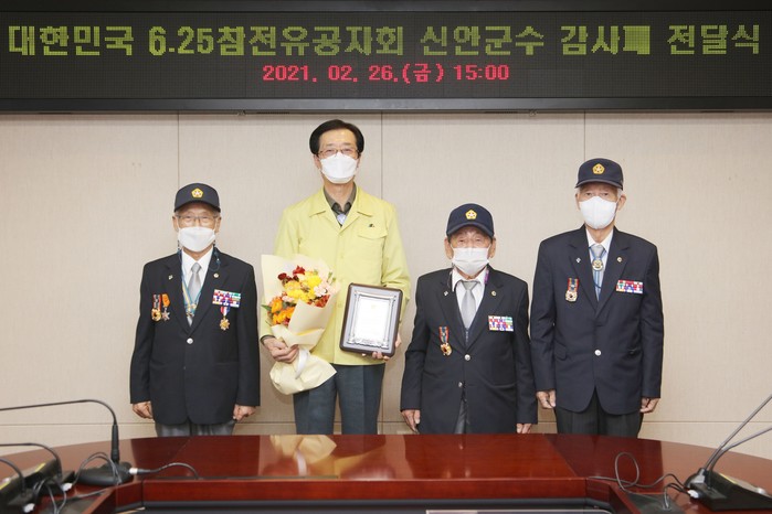 신안군(군수 박우량)은 국가를 위해 헌신하고 공헌한 호국영웅의 영예로운 복지증진에 기여하여 대한민국 6.25 참전유공자회(회장 노무식)로부터 지난 26일 감사패를 전달받았다.
