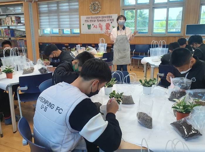 창녕군(군수 한정우)은 성산중학교에서 지난 20일 교직원과 학생 50여명이 참여한 가운데 청소년상담복지센터가 마련한 2021년 청소년동반자 ‘사월애(愛)’문화체험활동을 실시했다.